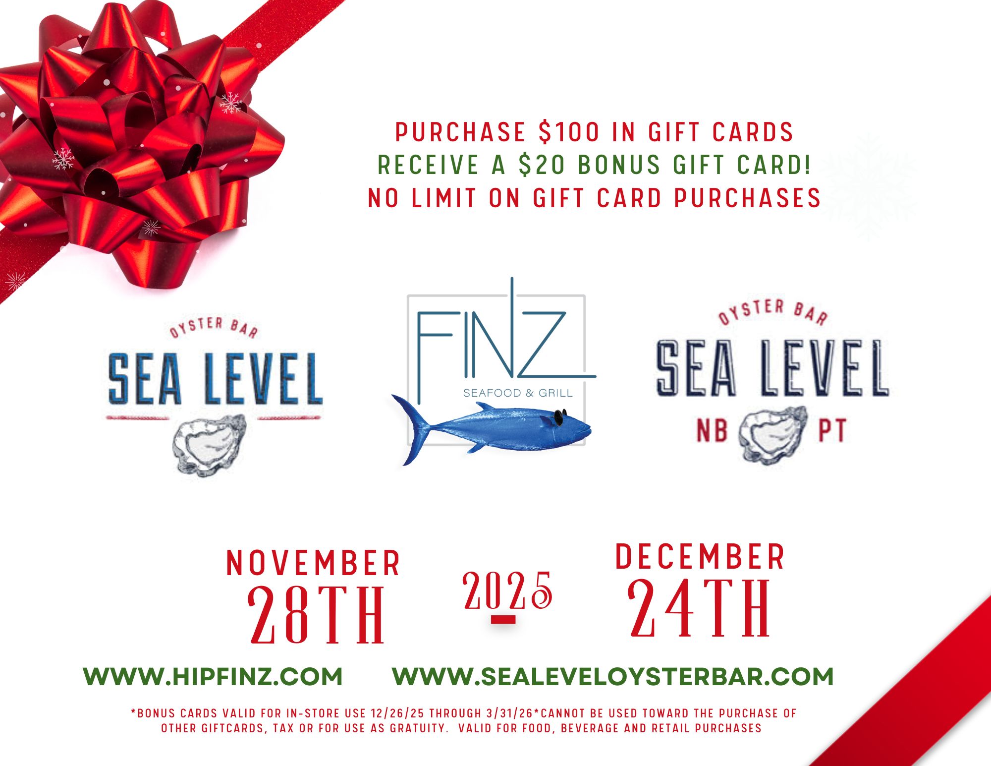 For every $100.00 in gift card purchases receive a $20.00 bonus coupon good for a future visit to Sea Level Oyster Bar. Purchase as many gift cards as you like no limit to the amount of bonus coupons earned. Bonus coupons will expire on March 31st 2026. Coupons are good for food, beverage and retail. Coupons cannot be used for tax or gratuity. Treat the coupons like cash as they cannot be replaced if lost or stolen.